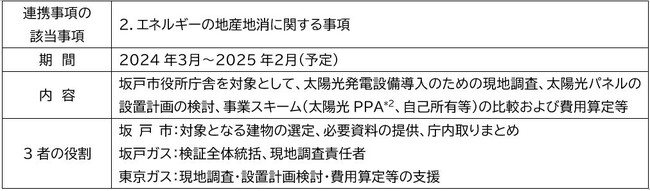 東京ガス株式会社(社長:笹山 晋一、以下「東京ガス」)は、このたび、脱炭素のまちづくりに向けた包括連携協定*1に基づき、太陽光発電設備導入の共同検証に関する基本合意書を坂戸市(市長:石川 清)、坂戸ガス株式会社(社長:花田 浩)と締結しました。
