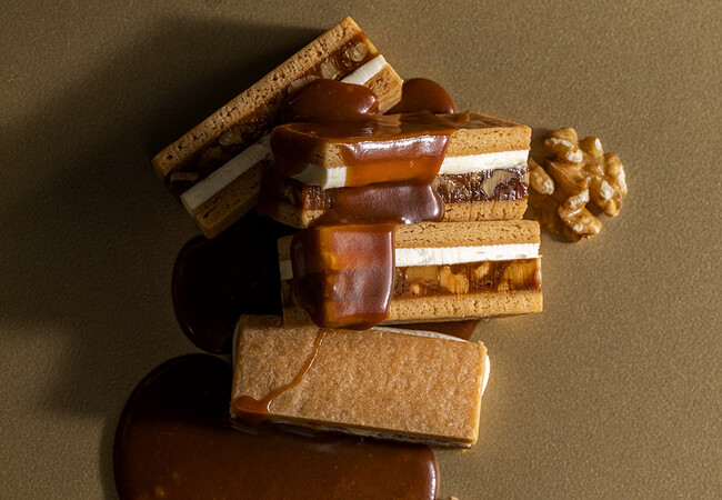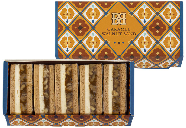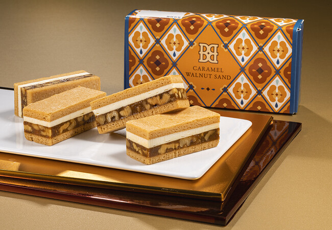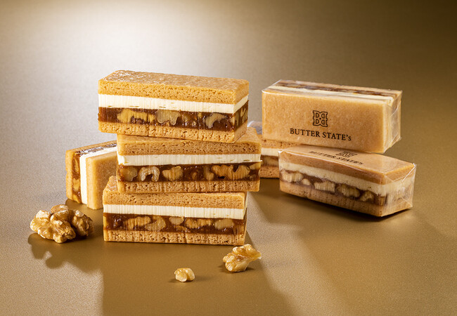 バタースイーツ専門店『BUTTER STATE's(バターステイツ)』から昨年好評いただいた『キャラメルくるみサンド』が期間限定で登場いたします。自家製キャラメルにくるみを敷きつめて バタークリームと2層に重ねたこっくり秋色のバターサンド。バタースイーツ専門店だからこそ生まれた、バターとキャラメルのうまみがとろけあうこだわりの味わいを心ゆくまでご堪能ください。