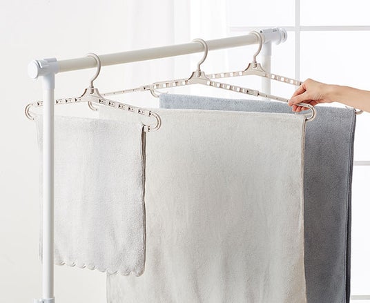 干したいものに合わせて約41.5cmから約69cmまで手軽に伸縮可能。大きめのバスタオルもしっかり干せるサイズになります。使用後は縮めてコンパクトに収納できるのも嬉しいポイントです。