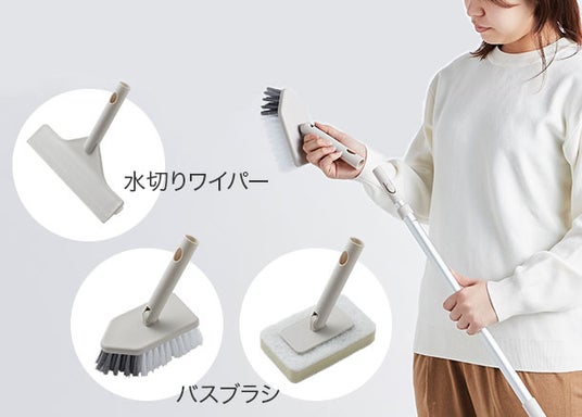 伸縮ポールと水切りワイパーで高いところの水切りも簡単!バスブラシやバススポンジに付け替えれば立ったままで浴槽や浴室のお掃除がラクラクにできます。