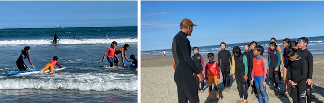 次に子どもたちは海を感じるため、サーフィンを体験することに。体験場である茨城県の大洗サンビーチは、海岸が広く海水浴場としても人気です。一方、同じ茨城県の阿字ヶ浦海岸は港の影響のため、砂浜が狭くなり海水浴場が減り消波ブロックが置かれ波が立たず、サーファーが減りました。子どもたちは両海岸を見学し、その海岸の広さを比較し人間との生活と海の関係を学びました。子どもたち全員がサーフィン未体験の中、果敢にチャレンジ。最後には自らパドリングして海に向かっていき、海を楽しみました。またサーファーたちの海への取り組み「ワンハンドビーチクリーン」を知り、自分のできることを考えました。