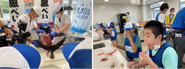 その後、養殖のクロマグロ解体ショーが行われ、マグロの部位、自然のクロマグロはどこから栃木県に入ってくるのか、を説明いただきました。普段まるごとのマグロを目にすることのない子どもたちは、約40kgあるマグロの解体作業を手伝い、その大きさ、色に驚いていました。最初は尻込みしていた子どもも解体に参加し、解体後のその顔には自信がみなぎっているように見えました。解体中、子どもたちは「このマグロは、大きい方か」「生まれて何年たったものか」「どうして、この部分は黄色いのか」など自分から積極的に質問をしていました。その後、子どもたちは柵にしたマグロを寿司用に切り身にし、寿司を握って、海の恵みをいただきました。自分の手で魚を取り扱うことで、講義で学んだ海水温上昇や海洋ごみなどによる海洋環境の変化が魚類に直接の変化を及ぼしていることを、肌で感じられたようでした。