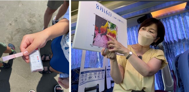 海水の温度は温度計、酸性度はリトマス紙を使い、実際に計測し「海の健康診断」を行いました。グループごとに計測したところ海水温は22~24度、酸性度はややアルカリ性を示しました。