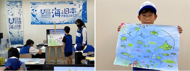 宇都宮文星女子高校の宮本先生指導のもと「理想の海、私の想う海」等をイラストで表現しました。子どもたちはそれぞれ真剣に制作し完成させた後、1人づつ発表を行いました。発表の模様はインスタライブ中継をすると同時に、保護者の方にも観覧いただきました。子どもたちは「ごみのない海になっているといいな」「きれいな海には恐竜も住んでいるかもしれない」「きれいな海には色とりどりの魚が増えるかもしれない」とそれぞれの思い描く海を発表しました。この時制作した絵は日本財団 海と日本プロジェクトの一環であるプロジェクト「うみぽす」とコラボして、県内寿司チェーンとのコラボ商品等にしようと検討中です。