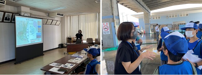 1限目で海洋ごみや海洋環境の変化によって「漁獲量に変化が生まれているのでは?」と考えた子どもたちは、次に栃木県から1番近い海である茨城県の海の環境を学びました。栃木県に降った雨や生活排水は、那珂川・鬼怒川・小貝川から茨城県の海へ流れつながっています。茨城県の海の特徴、海流の潮目が北上していること、海水温が上がってきていること、その影響で「タラ」の漁獲量が減ってきていると海の変化を知りました。その後、漁港で「せり」「しらすの水揚げ」を見学しました。子どもたちから「このコンテナ1個でいくらか」「漁場での仕事は何か」「氷で魚を保存するのはなぜか」「魚の仕事で楽しいことは何か」と質問があがりました。「漁場での仕事の説明」「氷で保存して新鮮さを保つ」「魚が売れて、みんなが魚を食べてくれると嬉しい」との答えをいただきました。