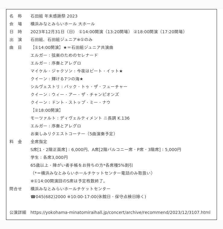 石田組ファンの方はもちろん、クラシックコンサートに馴染みが無い方にもオススメの公演です。
