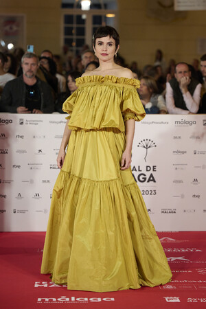 3月12日に開催された、第26回マラガ映画祭のレッドカーペットに登場した俳優のベロニカ・エチェーギ。マリア・グラツィア・キウリによる2023年クルーズ コレクションより、イエローシルクタフタのトップとスカートを纏いました。