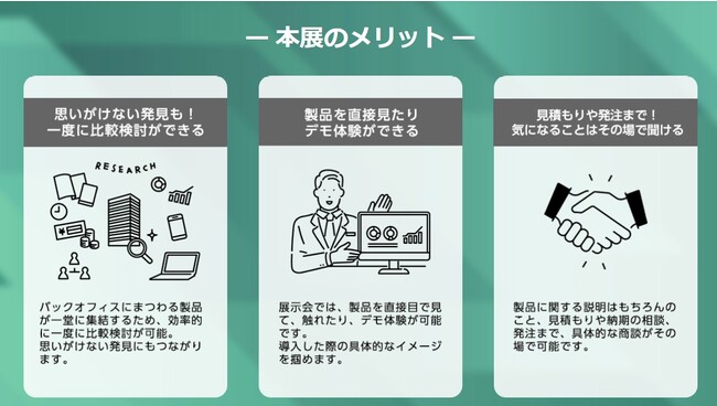 本展は管理部門の課題を一挙に解決できる展示会です。働き方改革・業務DX・SDGs経営などを実現する製品・サービスが多数出展。その場でデモ体験できるだけでなく、一度に比較検討・相談・発注まで行えます。