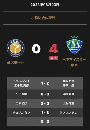 2023-08-20 一般社団法人Tリーグ ノジマTリーグ 2023-2024シーズン 公式戦 8月20日 開催 金沢ポート vs 木下マイスター東京 試合結果 Tweet ノジマTリーグ 2023-2024シーズン 公式戦 8月20日 小松総合体育館開催 金沢ポート vs 木下マイスター東京の試合は0-4で木下マイスター東京が勝利しました。 企業プレスリリース詳細へ PR TIMESトップへ 公式ツイッター Follow @Straightpress 最新情報をTwitterで受け取ろう! 公式フェイスブックページ 最新情報をFacebookで受け取ろう! 前の記事 一覧へ戻る 次の記事
