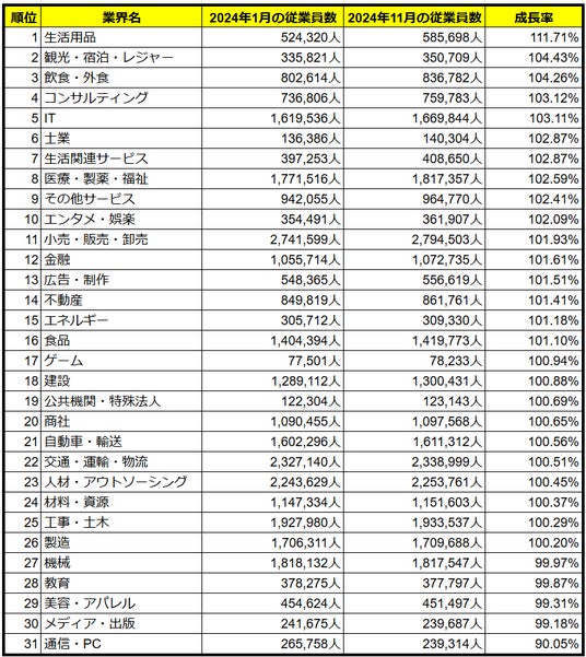 生活用品業界が成長率111.71%で1位を獲得し、日常生活に不可欠な製品の需要増加が背景にあると考えられます。また、観光・宿泊・レジャー業界や飲食・外食業界も引き続き堅調に成長し、経済活動の回復が従業員数の増加につながっています。