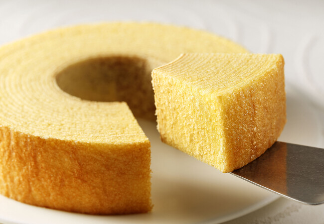 ねんりん家の誇る⼆大バームクーヘンのひとつ「ストレートバーム やわらか芽」。日本の味覚にふさわしい柔らかさを目指し、たっぷりの卵を贅沢に使ってふっくらとジューシーに焼きあげました。