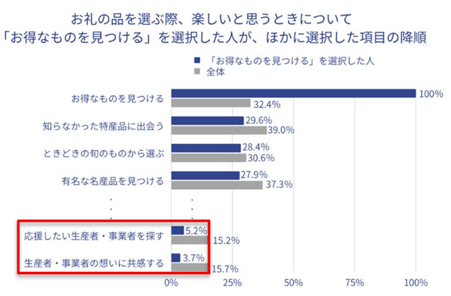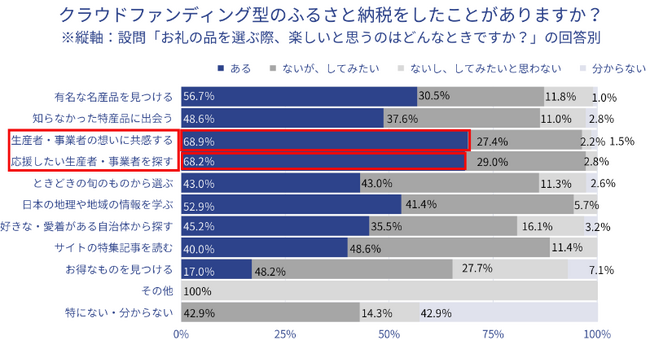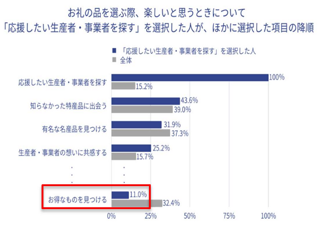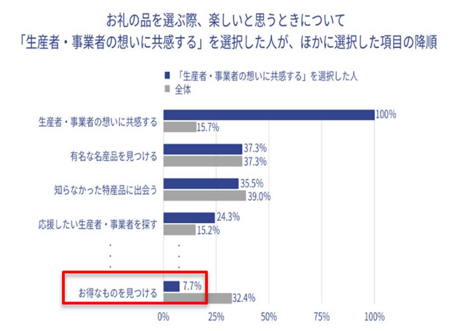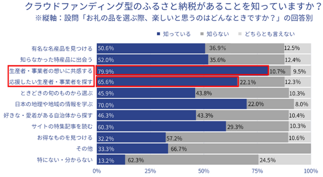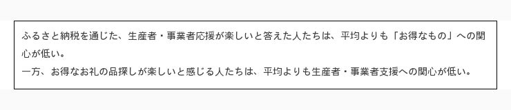 ・ふるさと納税のお礼の品選びで楽しいと思うとき(複数回答可)について、「お得なものを見つける」を選択した人は、生産者・事業者を支援できることが楽しいと思う割合が際立って低かった(「生産者・事業者の想いに共感する」は3.7%、「応援したい生産者・事業者を見つける」は5.2%)。「生産者・事業者の想いに共感する」「応援したい生産者・事業者を探す」を選択した人はいずれも、お得なお礼の品を見つけることが楽しいと思う割合が際立って低くなり(「生産者・事業者の想いに共感する」を選んだ人の7.7%、「応援したい生産者・事業者を見つける」を選んだ人の11.0%)、対照的な結果となった。