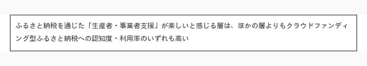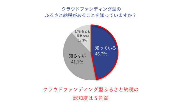 ・特定の地域課題を示してクラウドファンディング型で寄付を募るふるさと納税への認知度を調べると、知っている人が46.7%。そのうち寄付したことがある人は49.6%。