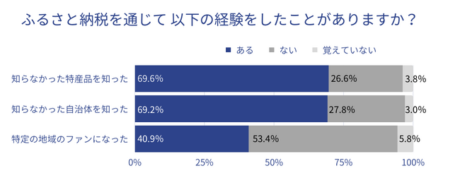 ・ふるさと納税を通じて知らなかった自治体を知ったことがあるのは69.2%、知らなかった特産品を知ったことがあるのは69.6%。