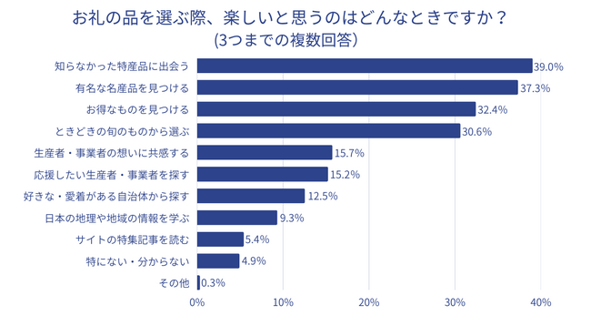 ・ふるさと納税のお礼の品選びで楽しいと思うときについて複数回答で選択してもらうと、「知らなかった特産品に出会う」(39.0%)が最多。次点より「有名な名産品を見つける」(37.3%)「お得なものを見つける」(32.4%)「ときどきの旬のものから選ぶ」(30.6%)「生産者・事業者の想いに共感する」(15.7%)「応援したい生産者・事業者を探す」(15.2%)の順となった。