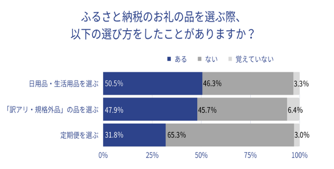 ・お礼の品選びをする際、「訳アリ・規格外」の品を選んだことがあるのは47.9%。「日用品・生活用品」を選んだことがあるのは50.5%。「定期便を選ぶ」は31.8%。