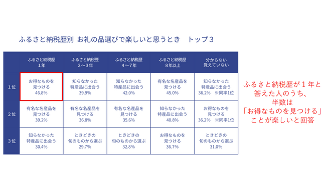 ・ふるさと納税歴が通算1年と回答した人のうち、約半数(46.8%)はお得なものを見つけるのが楽しいと回答。過去1年、物価高騰が顕著だったことも背景にあるとみられる。