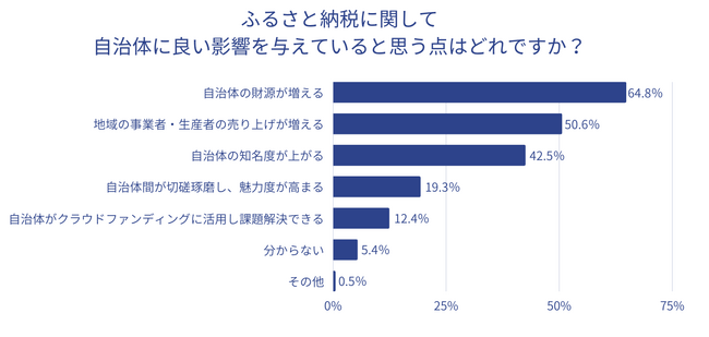 ・ふるさと納税が地域に生み出す好影響について複数回答可で尋ねると、最多は「自治体の財源が増える」(64.8%)。続いて「地域の事業者・生産者の売り上げが増える」(50.6%)。