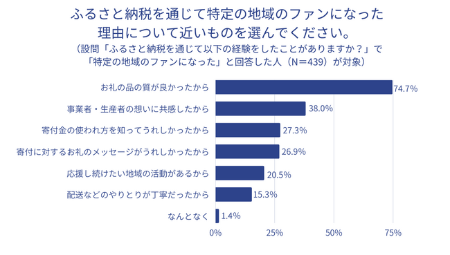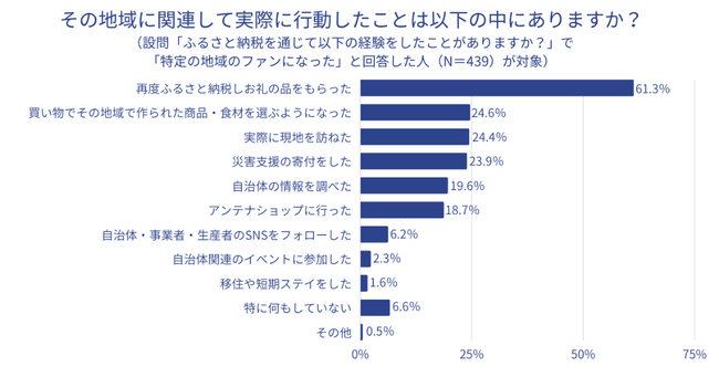 ・ふるさと納税を通じて特定の地域のファンになったことがあるのは40.9%。その理由は「お礼の品の質が良かった」が最多の74.7%。ファンになったことで実際に行動したことは「再度ふるさと納税し、お礼の品をもらった」が最多の61.3%。その他「買い物でその地域の商品・食材を選ぶようになった」「実際に現地を訪ねた」「災害支援の寄付をした」といった行動変容もそれぞれ25%弱で並んだ。