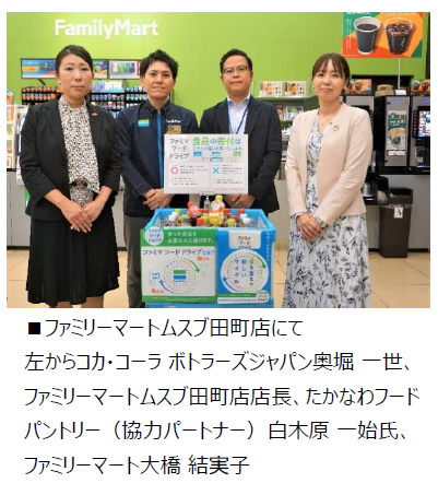 コカ・コーラ ボトラーズジャパンに地域の食支援の取組みである「ファミマフードドライブ」に飲料を寄贈いただくことで、食支援の必要な方に清涼飲料を味わっていただく機会をお届けできましたら幸いです。今後も一企業では成しえないことを連携・協業により実現させていくことで、活動の認知拡大に繋げることができればと考えております。