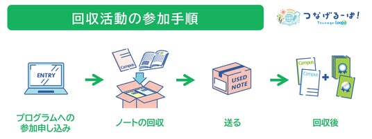 回収したノートをご送付いただいた学校へは、「つなげるーぱ!」にて回収した使用済みのノートを新しいノートの表紙に再利用した「キャンパスノート<つなげるーぱ!>」のサンプル2冊と、参加児童分の参加賞シールをお送りします。さらに活動終了後にお送りするアンケートにご回答いただくと、回収活動を推進してくださった児童分のノートをお送りします。リサイクルの結果が目に見える形になることで、今後の行動を考えるきっかけになることを願っています。