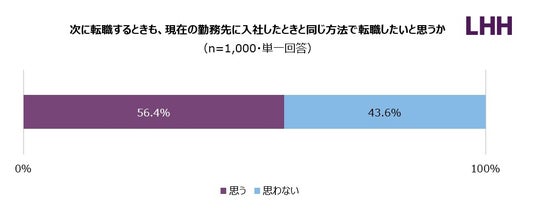 続いて、「あなたは、次に転職するときも、現在の勤務先に入社したときと同じ方法で転職したいと思いますか?」と質問したところ、56.4%が、「思う(次に転職するときも、現在の勤務先に入社したときと同じ方法で転職したい)」と回答しました。
