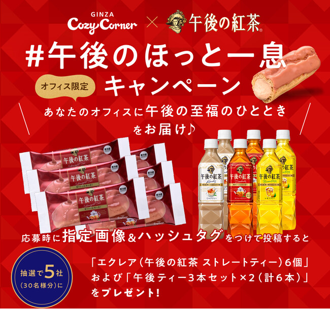そんなコラボスイーツの発売を記念し、6月22日(木)から、オフィス限定「#午後のほっと一息 午後ティーコラボキャンペーン」を開催。抽選で5社様に「エクレア(午後の紅茶ストレート)6個」、および「キリン 午後の紅茶 3本セット×2(計6本)」のセットをプレゼント!あなたのオフィスに午後の至福のひとときをお届けします。ぜひ職場のみなさまと、休憩時間にお楽しみください。
