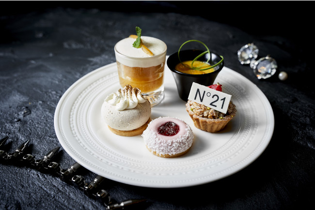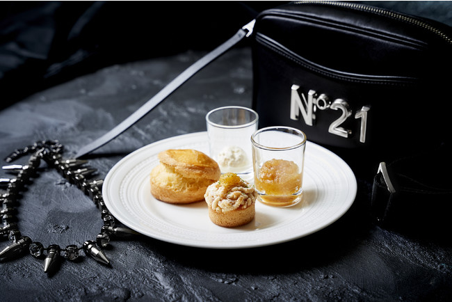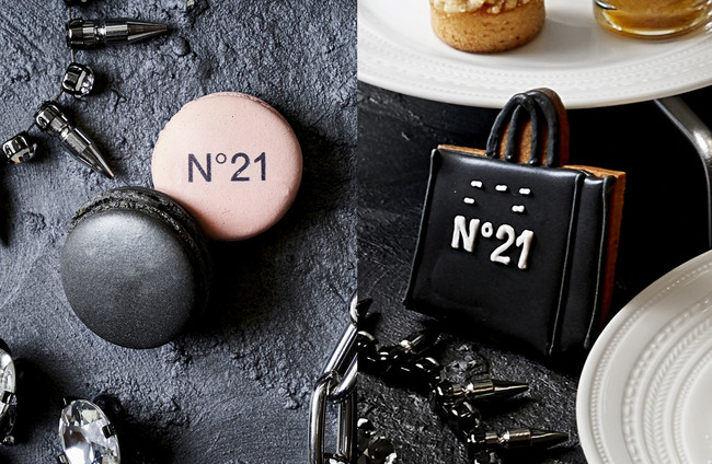 素材や見た目に細部にまでこだわったファッショナブルなアフタヌーンティーは、ブランドのアイコニックなバッグやアクセサリーとの相性も良く、モードなN21の世界観を存分に感じていただけることでしょう。通常のアフタヌーンティーの他にも、N21のロゴ入りマカロンのお土産が付いたプランや、シャンパーニュとN21のバッグをモチーフにしたクッキーとマカロンのお土産が付いたプランもございます。