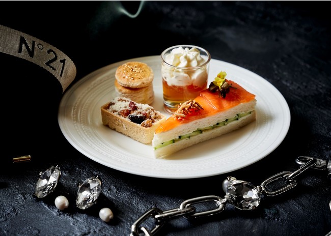 セイヴォリーのサンドウィッチは、サーモンと胡瓜が美しい層をなす伝統的なスタイルで、アクセントとしてフリンジを模したドライオニオンをトッピングしました。トップスとボトムが分かれたN21のスタイルを反映した「キャビア・バブルティー」は、トッピングのホイップクリームがシフォンの装いを感じさせ、キャビアやロブスターの風味も相まってリュクスな雰囲気を醸し出しています。