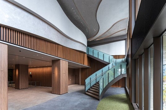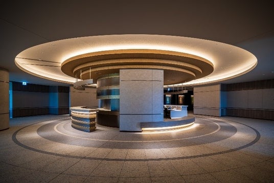 オフィスエントランスは“すじ雲”をモチーフとし、流動的で柔らかな空間を表現し明るい色調を基調とすることで、開放感のあるデザインとしています。