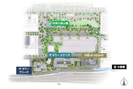 開発コンセプトを「緑があふれ都市と自然とが融合した街づくり」とし、人々の交流や人の賑わいの創出、緑の空間づくり等を目指した開発を進めてきた本事業は、「中野四季の都市(まち) 」(2012年完成)に隣接し、約1.5haの豊富な緑を有する「中野四季の森公園」の緑豊かなランドスケープともつながる一体かつ広大な緑地空間を創出します。また、2029年度にはJR「中野」駅とペデストリアンデッキで接続される計画となっており、中野駅周辺を訪れる多くの方の回遊性を高めます。