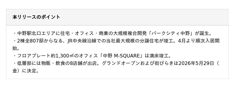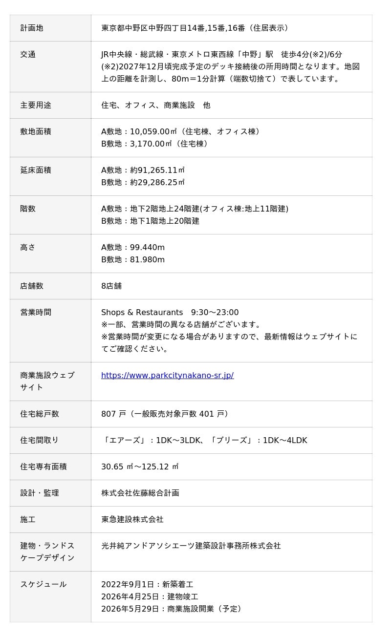 本事業は2棟・全807邸の大規模レジデンス「パークシティ中野 ザ タワー エアーズ / ザ タワー ブリーズ」と、オフィス棟「中野M-SQUARE」からなる複合用途の街区で、各棟低層部には物販・飲食の8店舗が出店します。商業ゾーンのグランドオープンおよび街びらきは2026年5月29日(金)を予定しています。