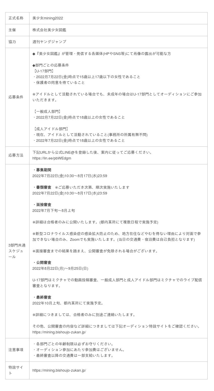 株式会社美少女図鑑(東京都渋谷区、代表取締役:中村孔亮)が運営する地域密着型メディア『美少女図鑑』は、株式会社集英社(東京都千代田区、代表取締役社長:廣野眞一)が発行する人気青年マンガ雑誌『週刊ヤングジャンプ』への誌面掲載をかけた美少女発掘オーディション「美少女mining2022」を開催いたします。現在、本オーディションへのエントリーを受付中です。【募集期間:2022年7月22日(金)10:30~8月17日(水)23:59】