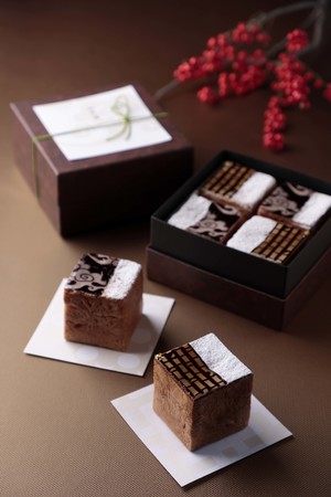 雲母唐長×リーガロイヤルホテル京都「お年賀キューブシュークリーム」は、通常販売しているキューブシュークリーム「4 saisons du Japonais(キャトル セゾン ド ジャポネ)」を三が日限定で、京都で 400 年続く日本唯一の唐紙屋を継承する「雲母唐長(きらからちょう)」の文様を用いた、年始にふさわしいスイーツを販売します。四角く焼きあげたシュー生地にパティシエこだわりのホイップクリームとカスタードクリーム入りの「プレーン」とチョコレートのホイップクリームとカスタード入りのお正月限定フレーバー「ショコラ」の2種を2個ずつ化粧箱に詰めた4個セットのキューブ型シュークリーム。「プレーン」には江戸時代から唐長が伝えている良き事を呼び寄せ、運気上昇を願う吉祥文様「天平大雲(てんぴょうおおぐも)」を。限定フレーバーの「ショコラ」には雲母唐長とリーガロイヤルホテル京都のコラボ文様で縁繋ぎや繁栄、変化の祈りを込めた「想いのたけ 巡るつき」の文様と金粉をあしらいました。お年賀の熨斗には、縁起の良い吉祥文様と四季折々の吉祥文様が楽しめる「カレ・ド・パピエ」全20種をランダムに用意。価格は2022年に合わせて2,022円(税込)で販売します。