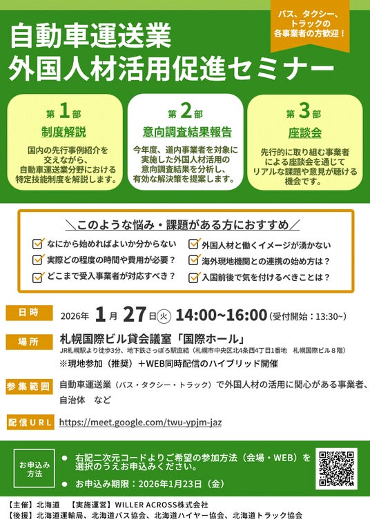 全国的に運転手不足への対応が喫緊の課題となっていることから、国では特定技能制度の対象分野に自動車運送業を追加したことを受け、道内事業者において外国人材の受入に向けた取組に着手できるよう、セミナーを開催します。