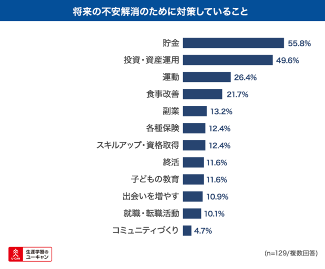 続いて「不安解消のためにしていることはなんですか」という質問に対しては、「貯金」が最も多く55.8%、次いで「投資・資産運用」が49.6%と、多くの人が金銭面の対策をしていることが明らかになりました。