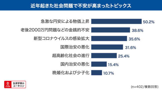 また、近年起きた社会問題で不安が高まったトピックスについて質問すると「急激な円安による物価上昇」が50.2%、「老後2000万円問題などの金銭的不安」が38.6%、「新型コロナウイルスの感染拡大」が35.6%、「国際治安の悪化」が31.6%、「超高齢化社会の進行」25.4%という結果になりました。