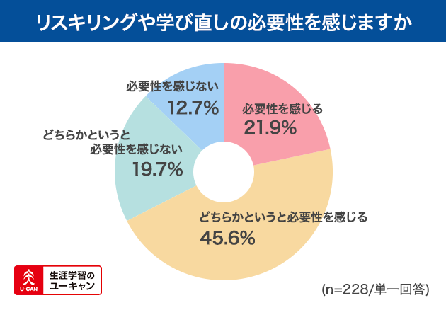 一方で、リスキリングという言葉を認知している方に対し、「リスキリングや学び直しの必要性を感じますか」と質問すると、「必要性を感じる」と答えた人は21.9%、「どちらかというと必要性を感じる」は45.6%と、半数以上の人がリスキリングや学び直しに関心があることがわかりました。