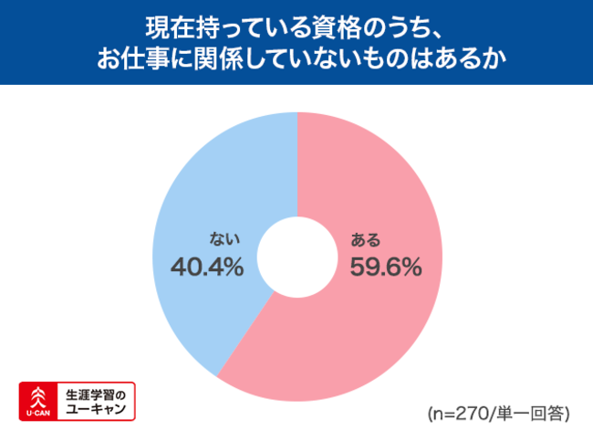 学びと人生の充実度の関連性が明らかになってきましたが、人々は何を目的として学んでいるのでしょうか。保有している資格について、「現職も含め今までのお仕事に関係していないものはありますか」に対して、「ある」が59.6%、「ない」が40.4%と、6割の方が仕事に関係していない資格を取得していることが分かりました。