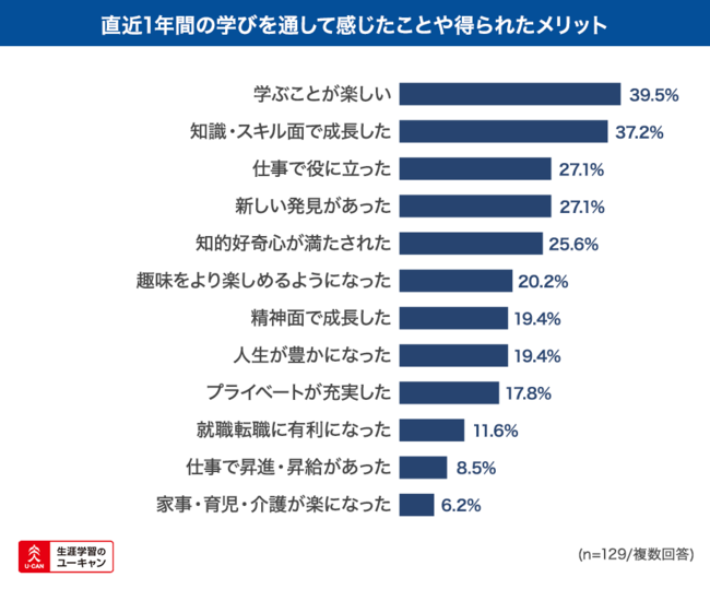 「直近1年間の学びを通して感じたことや得られたメリットを教えてください」という質問に対しては、「学ぶことが楽しい」が39.5%と一番多く、学びに楽しみを覚え、学ぶことそのものにポジティブな気持ちを持って学びに取り組んでいる人が多いことがわかります。