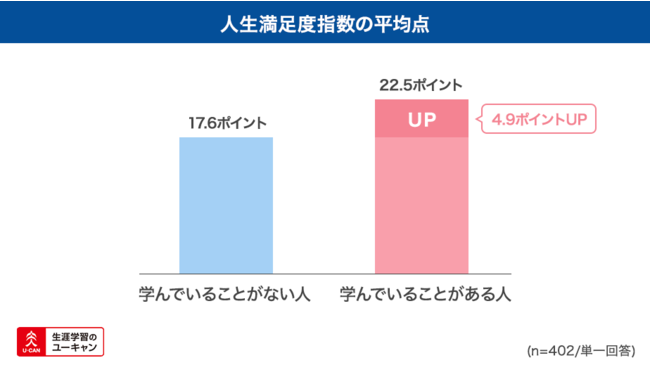 また、人生の充実度について国際的にも有名な指標である人生満足度指数に基づいて調査を行いました。人生の満足度に関する5問の質問の回答より人生満足度指数を算出したところ、「学んでいることがある人」の平均値は22.5ポイント、「学んでいることがない人」の平均値は17.6ポイントとなり、「学んでいることがある人」ほど、人生の充実度が高いことがわかりました。