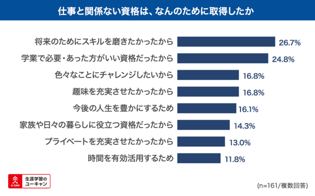 仕事に関係していない資格の取得理由を問うと、「将来のためにスキルを磨きたかったから 」が26.7%で最多となりましたが、「趣味を充実させたかったから」「色々なことにチャレンジしたいから 」がそれぞれ16.8%となりました。