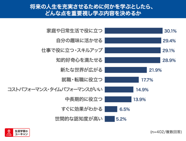また、「将来の人生を充実させるために何かを学ぶとしたら、どんな点を重要視し学ぶ内容を決めますか」に対しては、「家庭や日常生活で役に立つ」が最多の30.1%、次いで「自分の趣味に活かせる」が29.4%という結果になりました。
