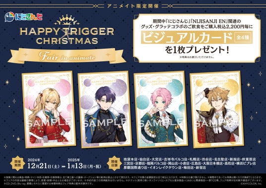 2024年12月21日(土)より、アニメイトにて『HAPPY TRIGGER CHRISTMAS』のフェアを開催!フェア期間中、「にじさんじ」「NIJISANJI EN」関連グッズ・グラッテコラボ飲食を2,200円(税込)ご購入ごとに、特典ビジュアルカード(全4種)を1点プレゼント!