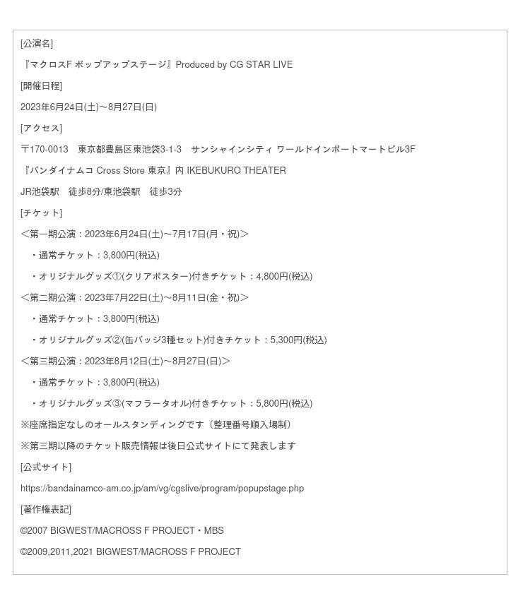株式会社バンダイナムコアミューズメントは、“銀河の妖精”シェリル・ノームと“超時空シンデレラ”ランカ・リーによるスペシャルな公演イベント『マクロスF ポップアップステージ』を、東京・池袋にある「バンダイナムコ Cross Store 東京」にて開催中です。また、第二期公演チケットの抽選申し込みも6月29日(木)まで受付中です。第二期でしか手に入れることのできないオリジナルグッズ(缶バッジ3種セット)は必見です。