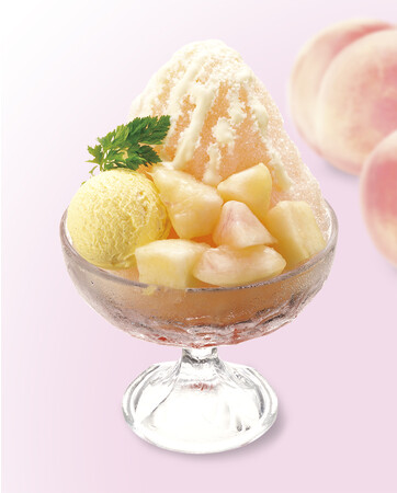 山梨県産の桃を使用。ひんやりかき氷に上品な甘みと香りのピーチシロップをたっぷりかけ、桃のとろける果肉とバニラアイスを添えました。練乳の濃厚なコクが、桃の爽やかな味わいとよく合います。
