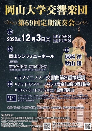 国立大学法人岡山大学(本部:岡山市北区、学長:槇野博史)の公認クラブである岡山大学交響楽団の第69回定期演奏会が、2022年12月3日に岡山シンフォニーホールにて開催されます。今年は、ラフマニノフ作曲の交響曲第2番ホ短調、チャイコフスキー作曲のバレエ音楽「白鳥の湖」より抜粋、そしてヨハン・シュトラウスII世作曲の皇帝円舞曲を演奏します。