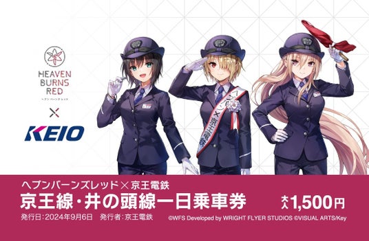 京王電鉄の駅係員・乗務員の制服を着用したコラボ等身イラストやコラボミニキャライラスト等をデザインした「オリジナルグッズ」、「ヘブンバーンズレッド × 京王電鉄 京王線・井の頭線一日乗車券」を発売します。