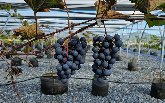 また営農面では、津波被災地でかさ上げされた土地で栽培できるよう根域制限栽培(ポット栽培)での栽培、パネル架台の高さを調整しワイヤーを設置することでぶどう棚としての活用、パネル自体をぶどうの生育を阻害する雨を防ぐ雨除けとして利用し、ぶどうの生育環境を整え、農作業を軽減する役割を果たしています。