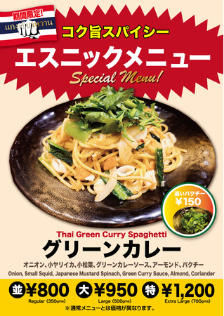 パンチの効いたクセになる味わいの焼きスパゲティ専門店として都内に5店舗を展開している「ロメスパバルボア」では、スペシャルメニュー「グリーンカレー」を5月10日(火)より期間限定で販売します。